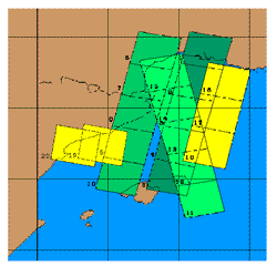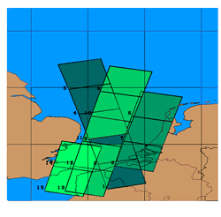 Where, S is the site: L: Gulf of Lion; N - North Sea; B - Baltic Sea, K Kattegat (in both North Sea and Baltic regions). INS specifies the instrument used, for example, SAR (Synthetic Aperture Radar) or GBT (ATSR derived gridded brightness temperature), etc. In order to specify the date in such a way as to allow straightforward chronological sorting, an eight digit date using zeros to fill blank spaces was adopted as yymmdd, e.g. 970715 is 15 July 1997. XX is the frame location according to the acquisition plan which is instrument specific. As an example, the SAR frame numbering scheme is illustrated in Figure 3-1. Finally, V is the version number, required to track changes to the processing or correction of data as algorithms improve. The extension .hdf was also included to allow PCs to identify the file type.