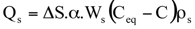rs is the sediment specific mass, DS is the elementary horizontal surface through which the rate is passing, a is a coefficient between 0 and 1 linked to the turbulence level, and Ceq is the equilibrium concentration (w.r.t. convection effect only) given by :