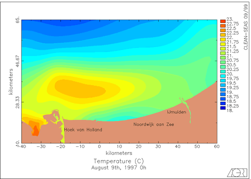 Despite the limitations on the surface temperature field derived from the model, the sediment fields (Figure 4-12) appear to be rather well represented by the model. The general distribution shows the sediment travelling NE along the coast creating a broad band of high sediment, almost as far north as Noordwijk. This is reflected in the MOS image of 19 August (Figure 4-10), and the visible channels of AVHRR (Figure 4-9). There is also a distinct sediment maximum close to the mouth of the Rhine, forming a hook to the south-west of the Rotterdam Seaway, also seen in the AVHRR image for 19th August. Some of the features absent from the model sediment field, such as the higher sediment concentrations near Ijmuiden and further north along the coast may attributed to missing sediment sources (the Ijmuiden outlet) and missing processes (resuspension of sediment by wave action) in the model. These could be rectified in am adapted model, if required.