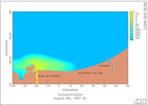 The results below (Figure 4-11) are sediment concentrations for this test period. From these results we can appreciate the extent of the Rhine outflow and the areas where the sediment is discharged and removed. In particular we can appreciate that the sediment motion and disposal will be located near the shore, particularly northward from the Rhine mouth. It is felt that improvements of the model will come by considering waves action, both through the current induced by wave breaking and associated erosion energy. Nevertheless, such sediment load should be compatible with visible signatures from ocean colour data.