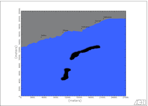 Gulf of Lion: Numerous oil spills have been detected on SAR images. Modelling of oil spill dynamics that are currently used are based on a global estimates of spill speed with respect to the wind speed and natural dispersion (vertical and horizontal) of the oil. The coastal area has been selected to be centred on Barcelona, extending 100 km south, west and east. The selected date is the 11th January 98 for which a SAR image gave a very clear picture of an oil spill. In this case the role of the model is to provide information, given an oil damping event, on a potential date and location of the impact at the coast.