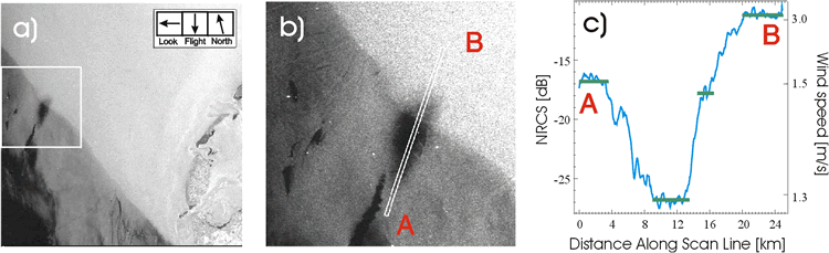 South-west of the front, surface films are visible as dark patches and lines, whereas north-east of the front no such signatures can be observed. A dark patch corresponding to a surface film is placed exactly on the front line (see the enlarged part of the SAR image shown in Figure 4-17b). In order to study the dependence of the radar signature of a surface film on wind speed we have calculated the reduction of the normalised radar backscattering cross section (NRCS) along the scan line inserted into Figure 4-17b. This scan (see Figure 4-17c) shows that on the low-wind side (towards point A), the NRCS reduction is about 10 dB (i.e., the NRCS drops down to the noise floor), whereas it is only about 6 dB on the high-wind side (towards point B, see the horizontal lines added into the scan). This finding is in accordance with recently presented results of field experiments in the North Sea (Gade et al., 1998b).