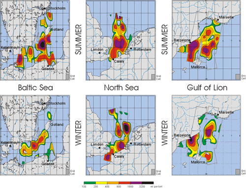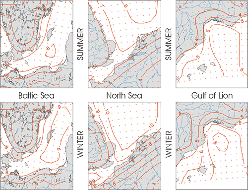 It can be seen that the maximum mean wind speed in the Baltic Sea test area (left column of Figure 4-18) lies between 8 and 9 ms-1 during summer and between 9 and 10 ms-1 during winter. The corresponding values for the North Sea test area (middle column) are 7 and 8 ms-1 (summer) and 10 and 11 ms-1 (winter), and for the Gulf of Lion test area they are 6 and 7 ms-1 (summer) and 8 and 9 ms-1 (winter), respectively. Thus, on average, oil spill detection using SAR techniques should be most successful in the Gulf of Lion during the summer period, and it should be least successful in the North Sea test area during winter period.