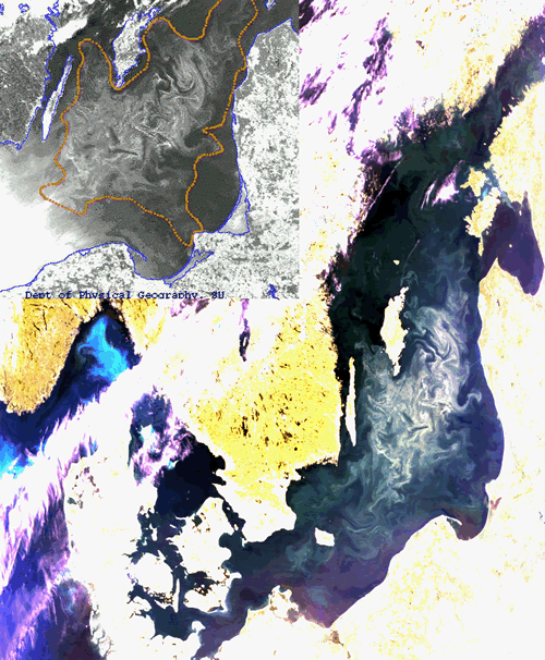 The process of detecting and monitoring the cyanobacterial (blue-green algae) blooms in the Baltic Sea relies on the visual interpretation of NOAA AVHRR channel 1 (visible) imagery. During conditions of strong surface accumulations the cyanobacteria becomes visible also in channel 2 (near-infrared), but not as spatially widespread as in Figure 4-23).