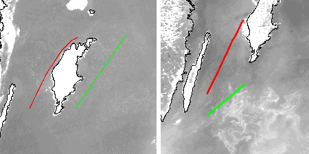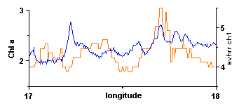 This time difference is intended to "compensate" for the behaviour of the algae to float to the surface and thereby becoming visible in the AVHRR imagery at a late bloom stage. To further fit the two curves to each other, they are spatially shifted approximately 5 km. This shift is intended to compensate for the water movement during the 5 days and the possible offset due to the time delay of the chlorophyll a measurements.