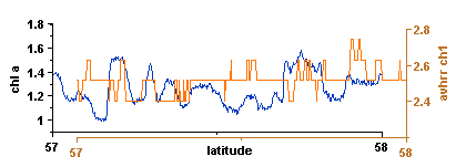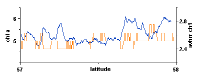 Figure 4-26. Chlorphyll a values from June 7, 1997 (blue), and AVHRR albedo values from June 12 (orange). The two curves are shifted apart for best fit.