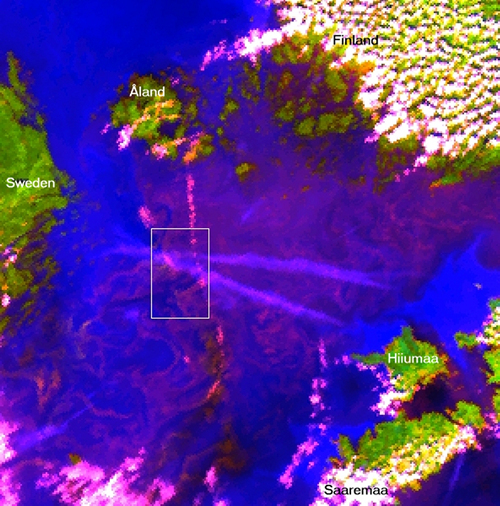 The summer (July - August) blooms in the open Baltic Sea are often dominated by the species Nodularia spumigena and Aphanizomenon sp. During the later phase of the bloom, algae start to flocculate and accumulate on the sea surface in large quantities, thereby becoming visible even with non-optimal satellite sensors. The possibility to detect the surface accumulations by a satellite sensor is most often limited to the visible spectral bands, but in areas of intensive surface accumulation, the near infrared band can also be used. The surface accumulations of cyanobacteria can in some cases cause local increases in the satellite-derived sea surface temperature (SST) due to increased absorption of sunlight by higher phytoplankton pigment concentration (Kahru et al. 1993).
