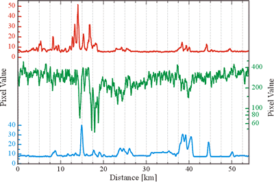 We have calculated profiles along the dashed lines included into each panel of Figure 5-2. The results are shown in Figure 5-3, where the upper (red) curve corresponds to the relative pixel values of the TM band 4 image, the middle (green) curve corresponds to the pixel values of the SAR image, and the bottom (blue) curve corresponds to the relative pixel values of the WiFS band 2 image. Note that the middle curve (SAR) is plotted in logarithmic scales for better visualisation.