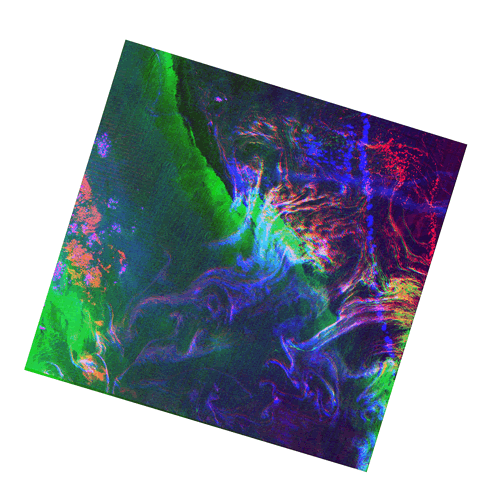 The obvious 'front' in the middle of the image (reaching from north-west to south-east) is visible in all investigated images and spectral bands. The homogeneous area to the left (west) of this front is due to somewhat colder and cyanobacteria-free water flowing from the Bothnian Sea southwards into the Baltic Proper. An area of high surface concentration of algae, which is likely to coincide with a locally low wind field, causes strong reduction of the radar backscattering (visible as a bright green patch in the image centre).