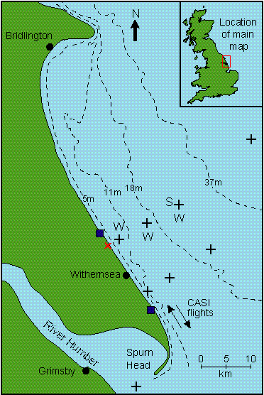 Figure 3: Wave measurements at Holderness (1994/95 and 1995/96) + indicates POL Measuring Platforms, with bottom pressure recorders, and directional wave measuring devices at nearshore stations). W is Waverider location, blue squares are OSCR HF radar shore stations (master and slave) and the red cross is the X-band radar shore station.
