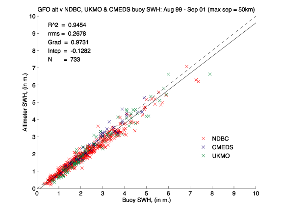 Geosat Follow On Interim Geophysical Data Records ("igdr") data were used, and were kindly made available by John Lillibridge from the US NOAA Laboratory for Satellite Altimetry. The in-situ data were from US, Canadian and UK offshore buoys. These data were available courtesy of the US National Data Buoy Centre (NDBC), Environment Canada (EC) and the UK Meteorological Office (UKMO). Data from buoys operated by the latter two agencies were retrieved from the NDBC web site.