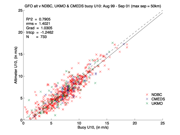From Table 3 we see that the gradients of the corrections derived from the regressions against the three buoy data sets are all consistent with each other (i.e. within 95% confidence limits), and none are significantly different from 1.0. Note the earlier GFO calibration (row 2) indicated a calibration gradient significantly less than 1.0, this indicated a significant overestimate (almost 30%) of winds by GFO, and was corrected by the time of the data for the second calibration (row 1).